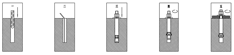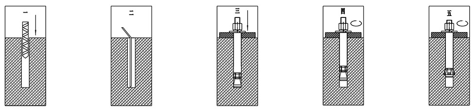 三、安裝前,先將錨栓各個(gè)部件手動(dòng)擰緊并保證錨栓各個(gè)部件不松動(dòng),同時(shí)鎖鍵呈未打開(kāi)狀態(tài),然后用錘子輕輕敲擊安裝工具,將錨栓推入孔中,直至套管末端面與混凝土基材平面齊平;